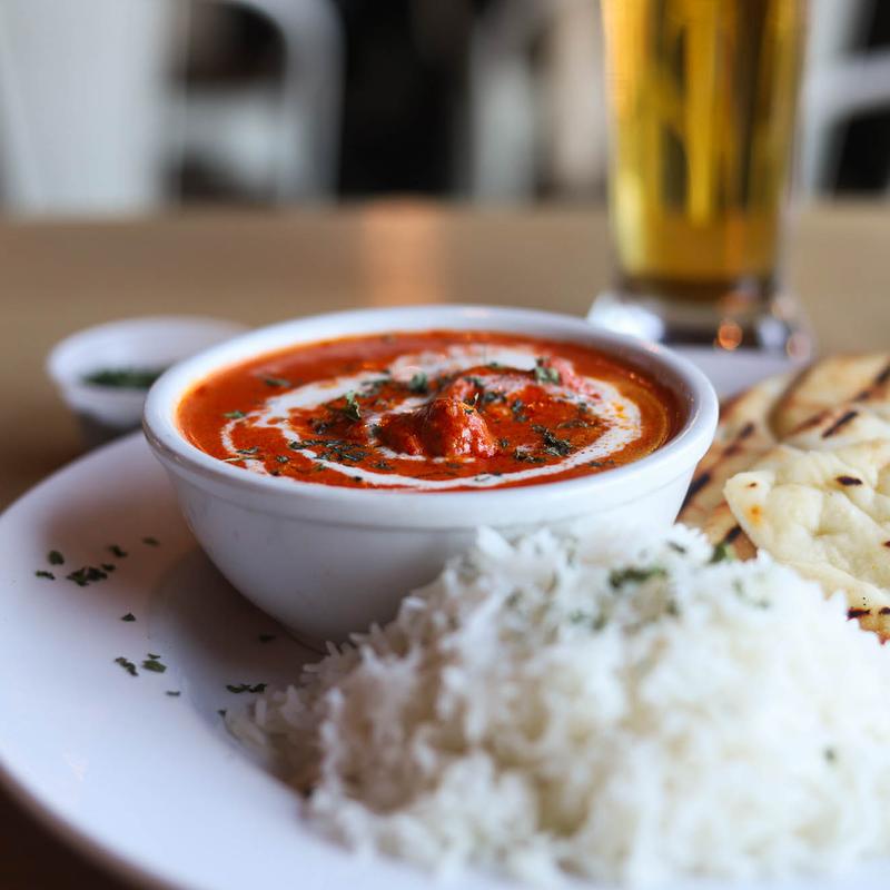 Marinated chicken thighs, house-made creamy marsala sauce, served on basmati rice with naan and garnished with cilantro.