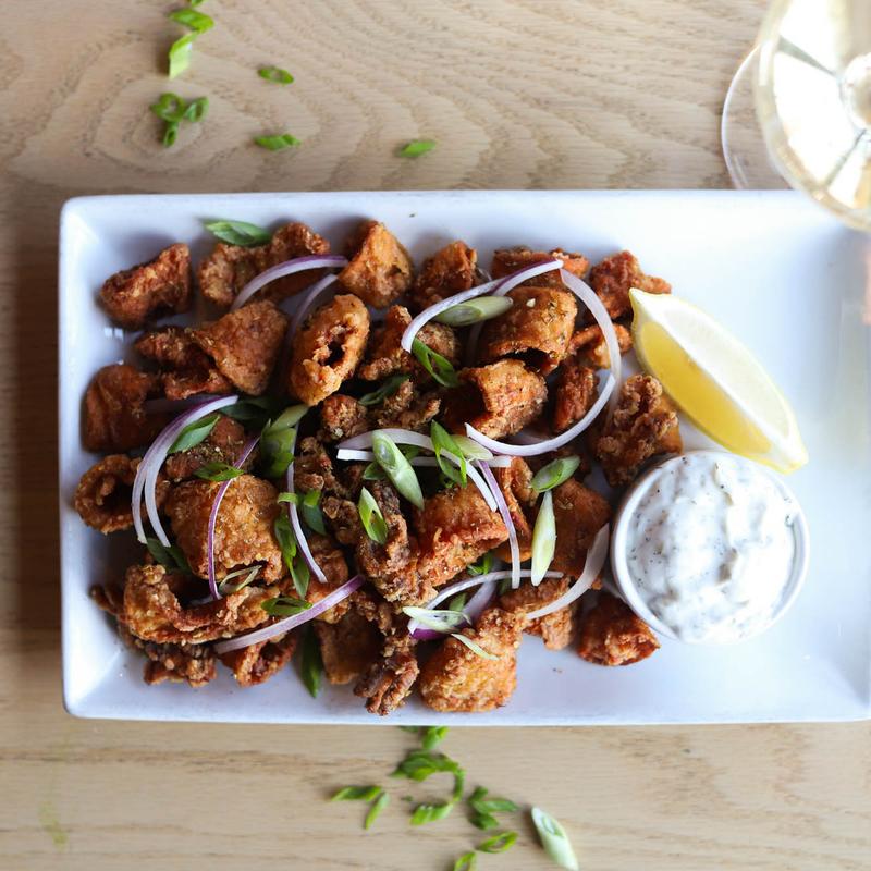 Marinated calamari, dusted and fried, green onions, red onions, lemon, and tzatziki.